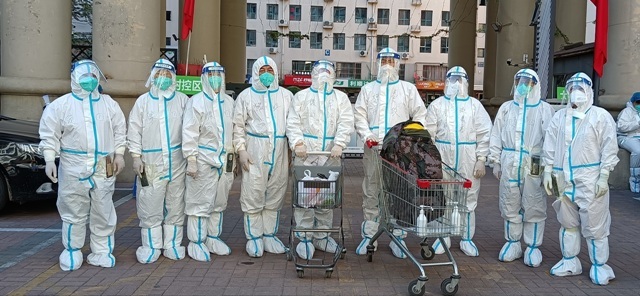 志愿者服務(wù)隊(duì)每天需要為小區(qū)的幾百戶居民發(fā)放防疫物資,挨家挨戶撿拾生活垃圾,為外賣(mài)、訂餐等進(jìn)行登記,并維持秩序。他們?nèi)蔽溲b,每天都要工作十多個(gè)小時(shí)以上。支援的第一天,他們?yōu)榫用癜l(fā)放蔬菜直到凌晨?jī)牲c(diǎn)多才回家。但是他們沒(méi)有退縮,沒(méi)有畏懼,不懼辛勞,勇于為他人服務(wù),充分體現(xiàn)了志愿者的崇高精神。志愿者服務(wù)隊(duì)中郭魯蒨同志是一名黨員,他表示:抗擊疫情人人有責(zé),作為一名老黨員更應(yīng)該在群眾有困難的時(shí)候沖在第一線,為疫情防控,保衛(wèi)家園貢獻(xiàn)自己的一份力量。